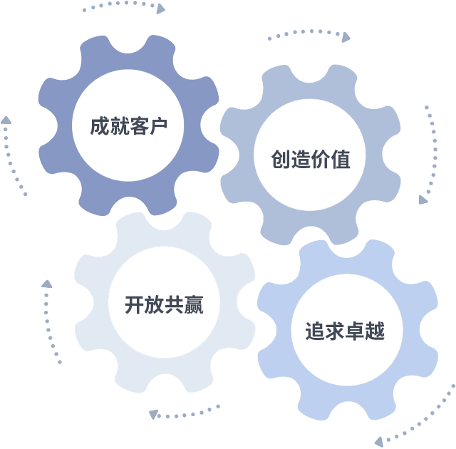 成就客户是一切决策的出发点,,创造价值是衡量所有工作的标准,,,追求卓越是我们做事做人的态度,,,,开放共赢是我们的格局也是最终的结果。。价值观的齿轮环环相扣,,推动着组织里的每个人不断向前。。。