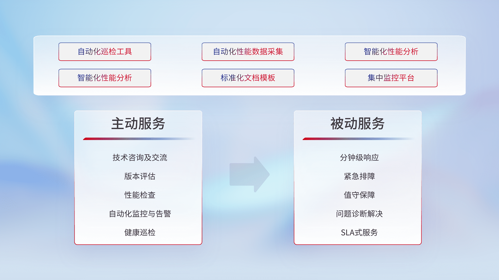 智能化工具和标准化文档,,保障服务质量,,,提供主动服务(包含技术咨询、、、、版本评估、、、性能检查、、、自动化监控与告警、、、健康巡检)和被动服务包含(分钟级响应、、紧急排障、、值守保障、、、问题诊断解决、、SLA服务)。。